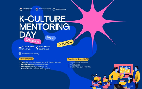 안녕하십니까? 주인도네시아 한국문화원은 한국문화 관련 산업 및 직무 체험을 통해 진로 탐색의 기회를 제공하는 “K-Culture 멘토와의 만남” 행사를 다음과 같이 개최합니다. 1. 행사 개요 - 일시 : 2026년 3월 3일(화) / 10:00-17:00 - 장소 : KOREA 360 메인 아트리움 2. 주요 내용 - 한국 문화 관련 직무 체험 부스 운영 - 분야별 멘토링 특강(세션별 시간 상이) ※ 멘토링 특강 세부 일정 및 참가신청은 아래 링크를 통해 확인 바랍니다. 링크 : https://forms.gle/hGPPHPAqZgmZ6JL48 감사합니다.