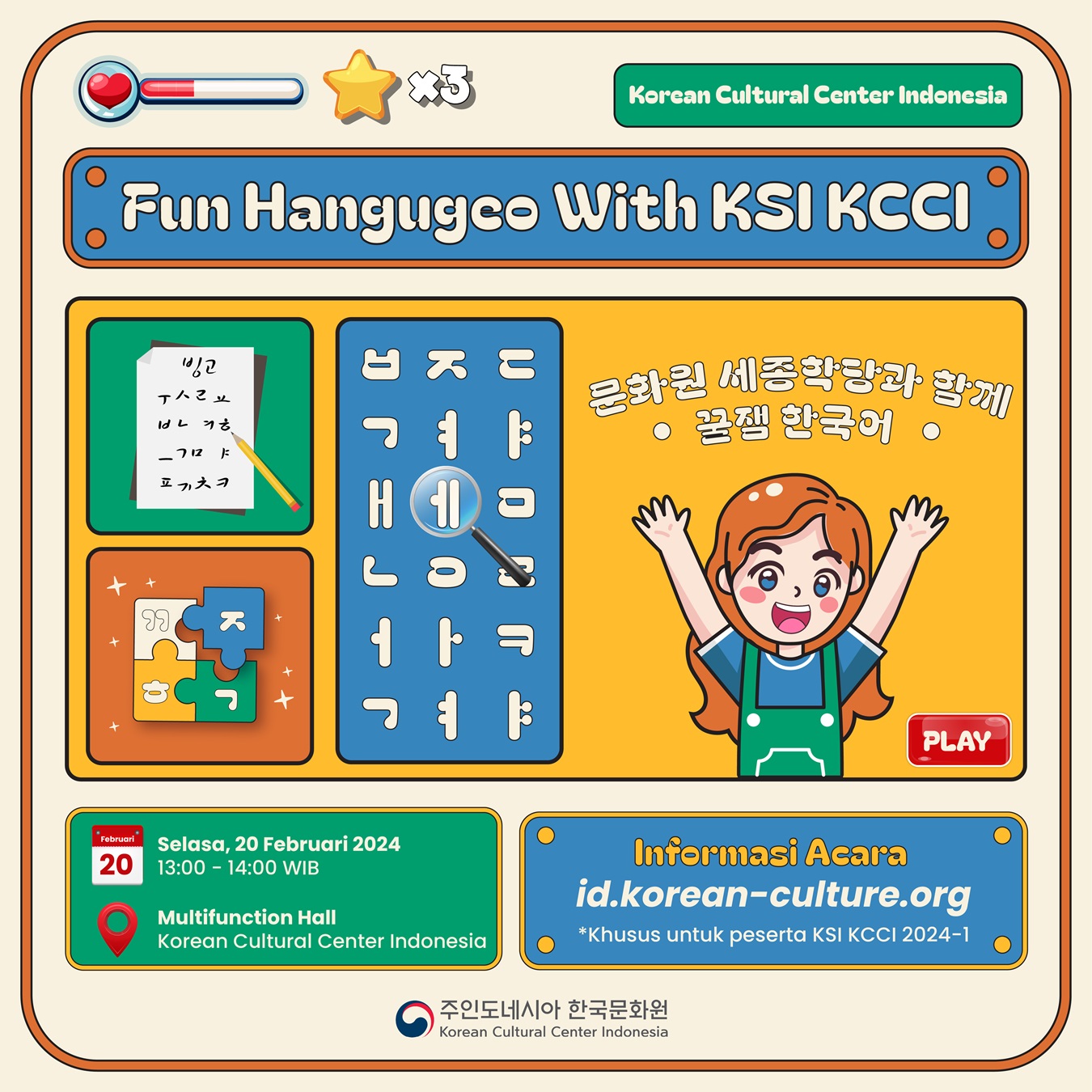 Dalam rangka untuk menjalin kebersamaan antar peserta kelas bahasa Korea KSI KCCI 2024-1, KCCI menggelar acara 'Fun Hangugeo With KSI KCCI' dengan rincian berikut: