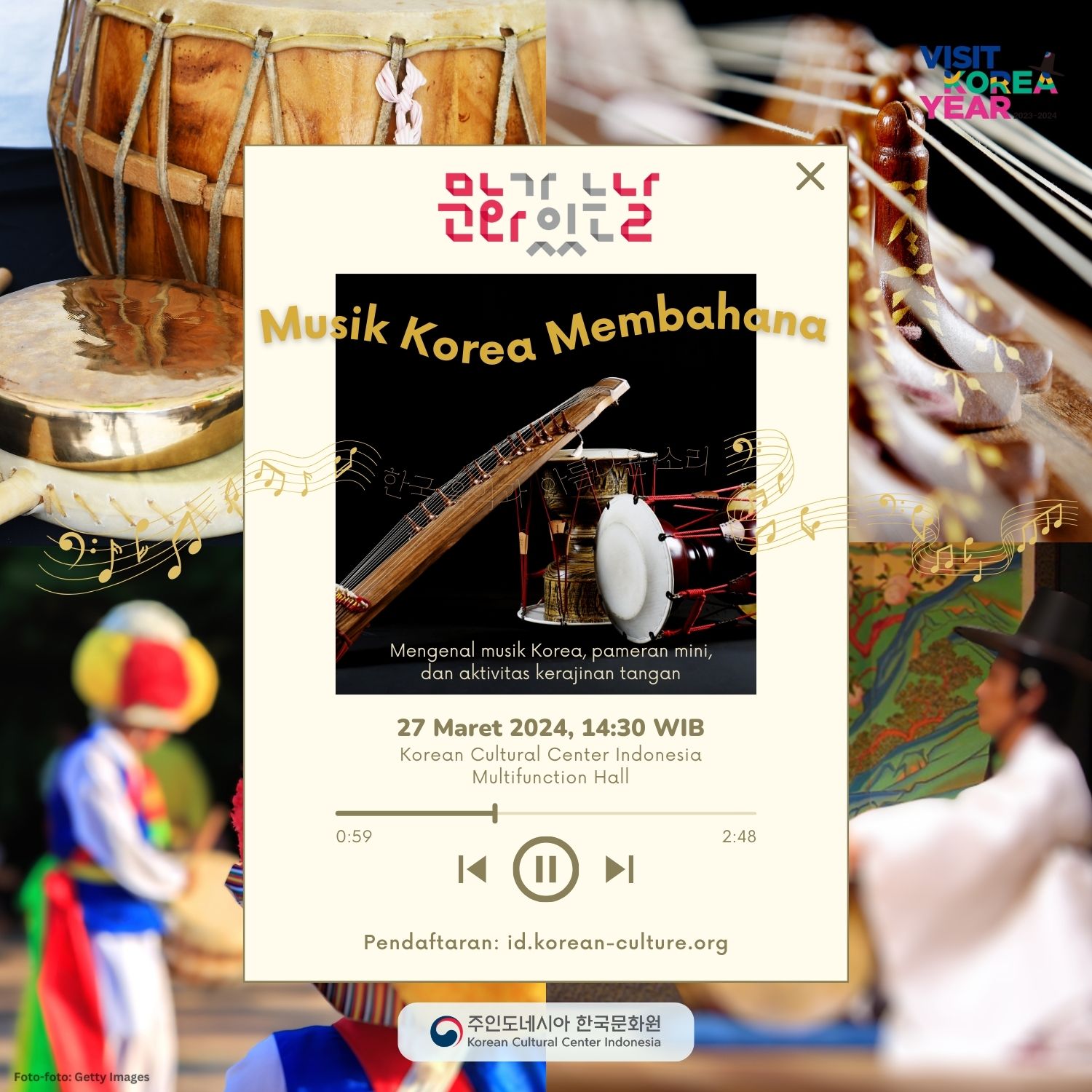 Dalam acara ini, Anda akan diperkenalkan dengan pertunjukan musik Korea, melihat pameran mini alat musik Korea, dan diajak membuat kerajinan tangan berupa replika mini alat musik tradisional Korea.