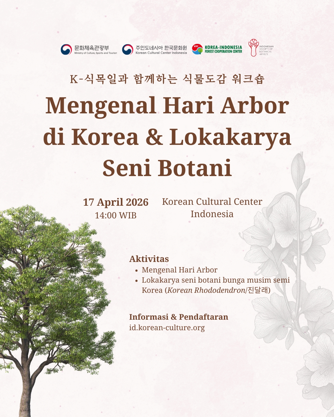 Korean Cultural Center Indonesia (KCCI) mengundang Anda untuk mengikuti acara Mengenal Hari Arbor di Korea dan Lokakarya Seni Botani. Dalam acara ini akan ada pengenalan Hari Arbor Korea bersama Korea-Indonesia Forest Cooperation Center (KIFC) dan Lokakarya Seni Botani bersama Indonesia Society of Botanical Artists (IDSBA).