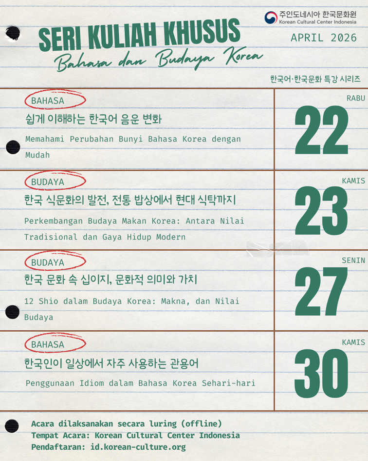 Korean Cultural Center Indonesia (KCCI) mengajak Anda untuk bergabung di rangkaian kuliah khusus dengan tema "Bahasa dan Budaya Korea" yang akan diselenggarakan dari tanggal 22 hingga 30 April 2026 dengan jadwal berikut:
