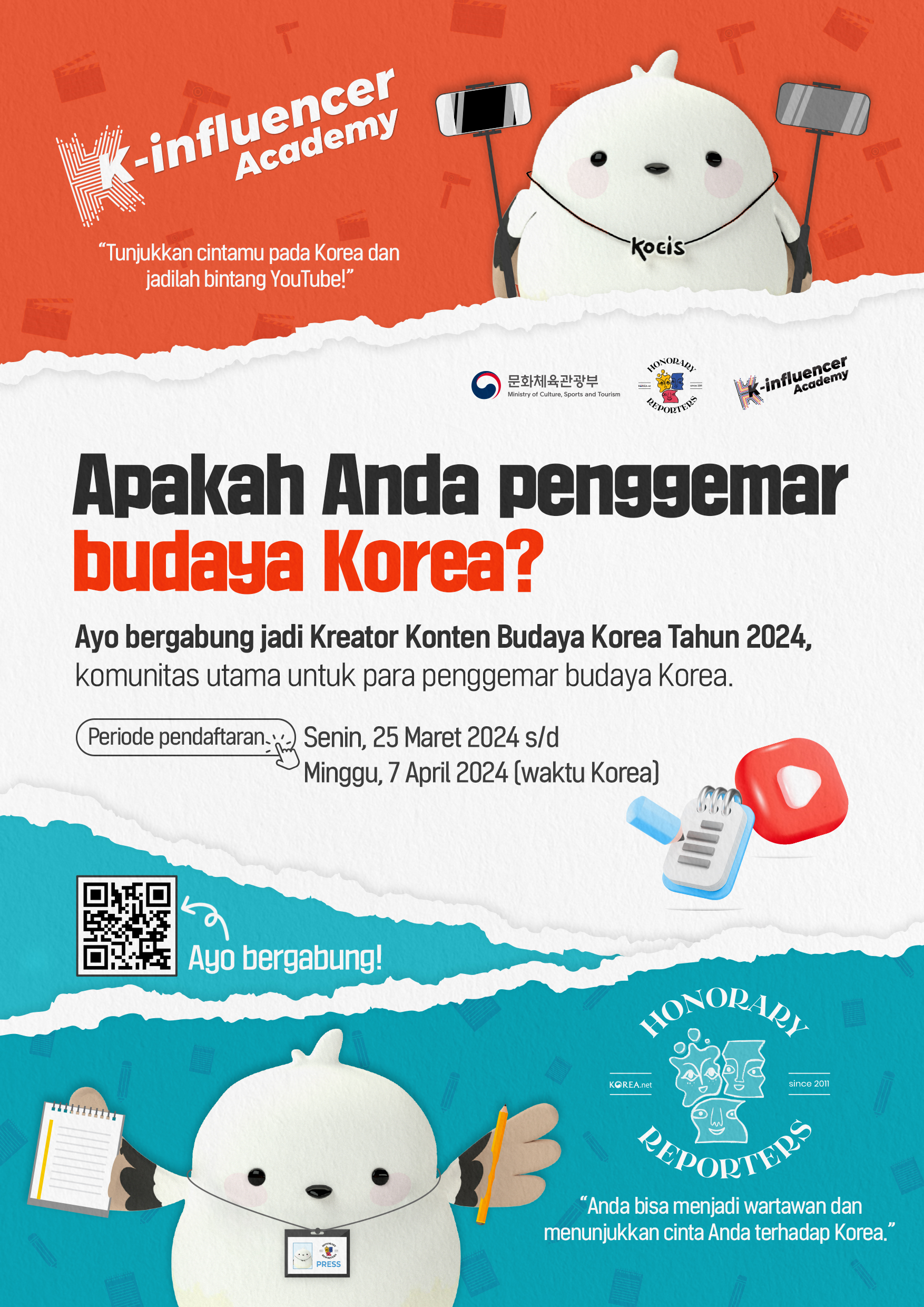 Anda bisa bergabung menjadi Wartawan Kehormatan Korea.net dan/atau K-Influencer periode tahun 2024 untuk mempromosikan Korea bersama dengan Kementerian Kebudayaan, Olahraga, dan Pariwisata.