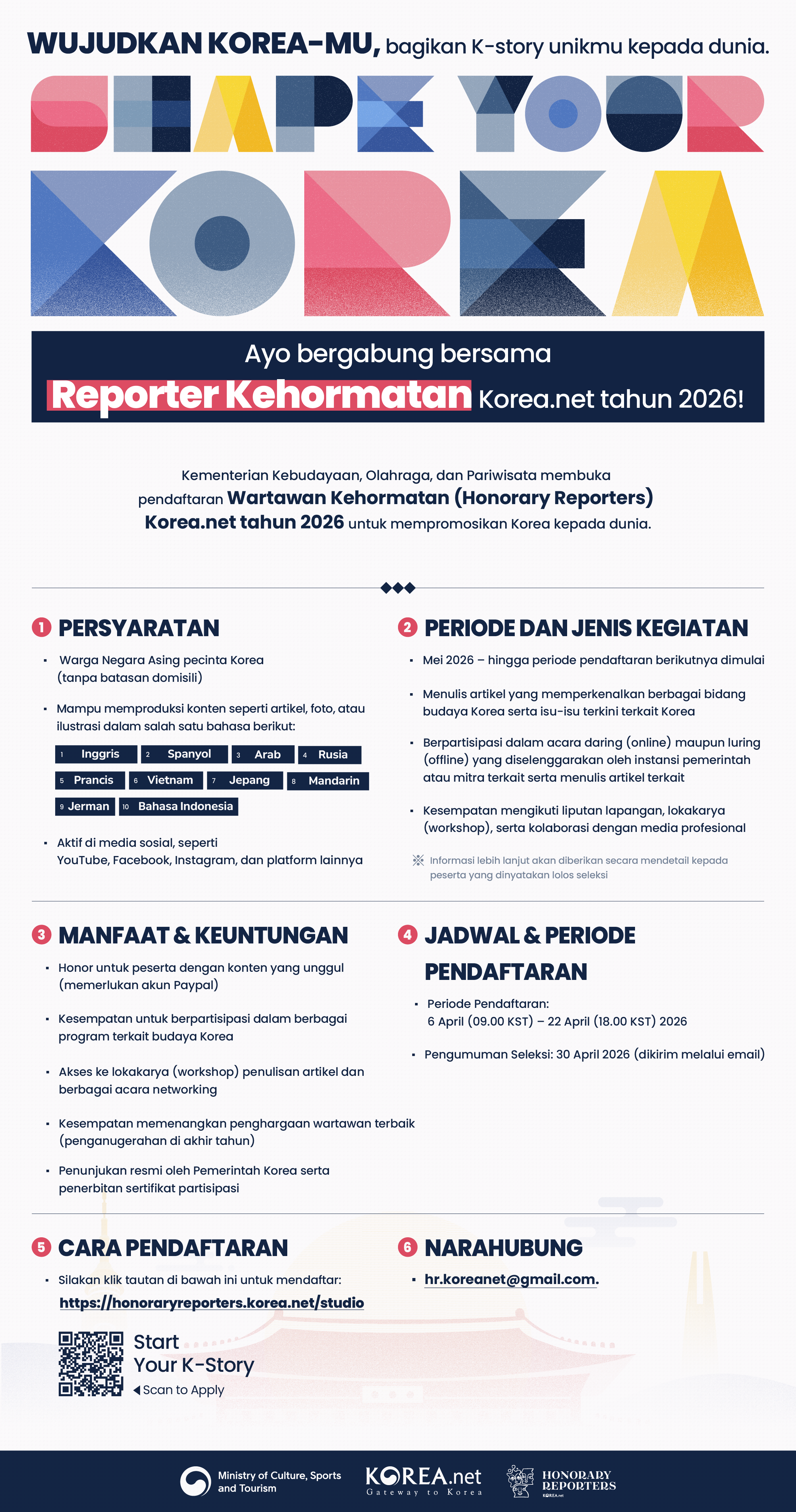 Kementerian Kebudayaan, Olahraga, dan Pariwisata membuka pendaftaran Wartawan Kehormatan (Honorary Reporters) Korea.net tahun 2026 untuk mempromosikan Korea kepada dunia.
