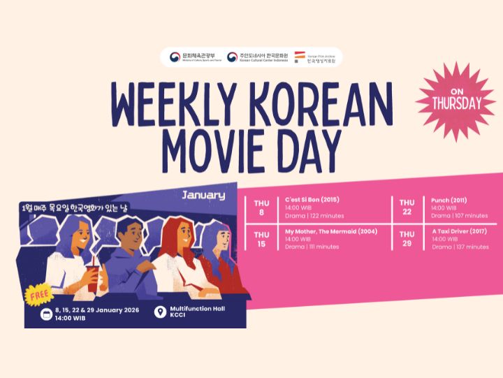 안녕하세요, 주인도네시아 한국문화원에서 다음과 같이 한국 영화 상영회를 개최합니다. o 일시 : 2026년 1월 매주 목요일 / 14:00(WIB) o 장소 : 주인도네시아 한국문화원 다목적홀 o 상영 일정 날짜 영화 제목 감독 / 주연 상영 시간 1월 8일 세시봉 김현석 / 정우 122분 1월 15일 인어 공주 박흥식 / 전도연 110분 1월 22일 완득이 이한 / 김윤석 107분 1월 29일 택시 운전사 장훈 / 송강호 137분 o 신청방법 : 링크를 통한 온라인 사전 접수 ※ 링크 : https://url.kr/tiy6t3 많은 관심 부탁드립니다.